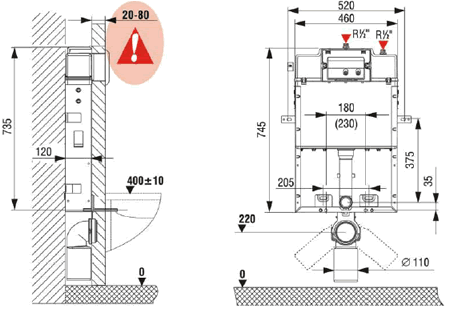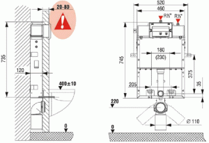 Предварително изработен вграден елемент за вградени в стената тоалетни казанчета, предно активиране, тоалетно казанче дълбочина 120mm, височина на инсталиране 1055mm. Предназначено за вградена в стената или пристенна масивна инсталация . Тоалетното казанче може да бъде изградено в рамките на мимимум 20 мм до максимум 80 мм от дълбочината му .