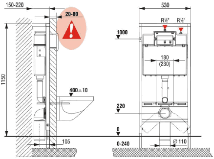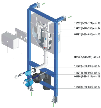 Сухо-монтирани вградени елементи за стенни тоалетни с вградени тоалетни казанчета с предно активиране, вградени на височина 1150 mm. Предназначени за инсталиране в преградни стени , като свободно-стоящи елементи за пристенно инсталиране за сухи монтажи , за пристенно ъглово инсталиране, и за универсални масивни инсталации инсталирани в стената.