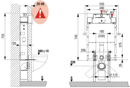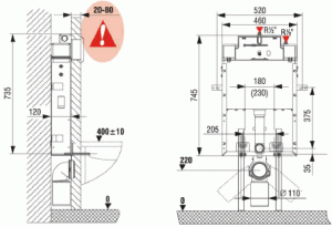 - две подпори с нарез с M 12 гайки за виксиране към тоалетната с осова дистанция 180 или 230 mm